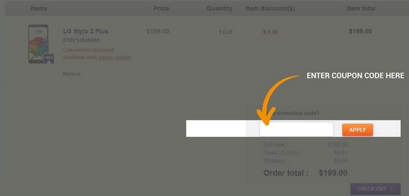 Click the CART icon to proceed. Copy and paste your MetroPCS coupon code in the box for the “promotion code” and click APPLY.